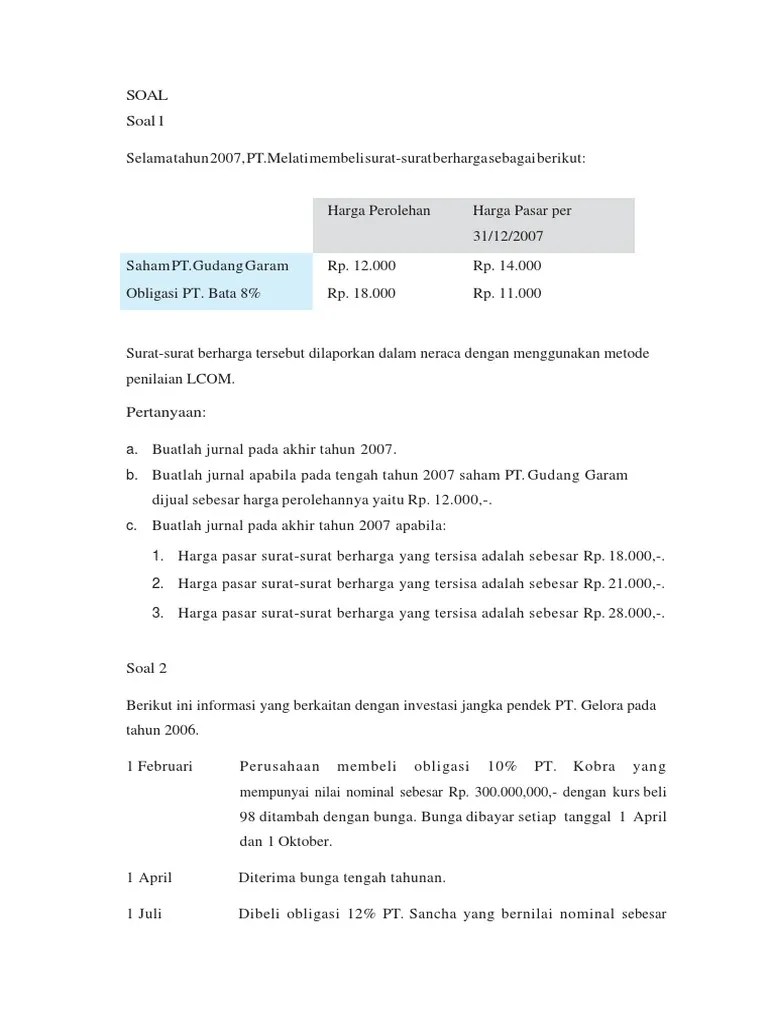 Di dalamnya diberikan tanggal dan ditandatangani di suatu tempat. Jika pt jaya wijaya pada tahun 2007 merencanakan menjual produknya senilai rp. contoh soal investasi jangka panjang dalam bentuk surat berharga saham soal. soal uas teori akuntansi genap 2020. Hai sobat gogo prodi akuntansi keuangan kali akan membahas mengenai sekuritas dilutif.